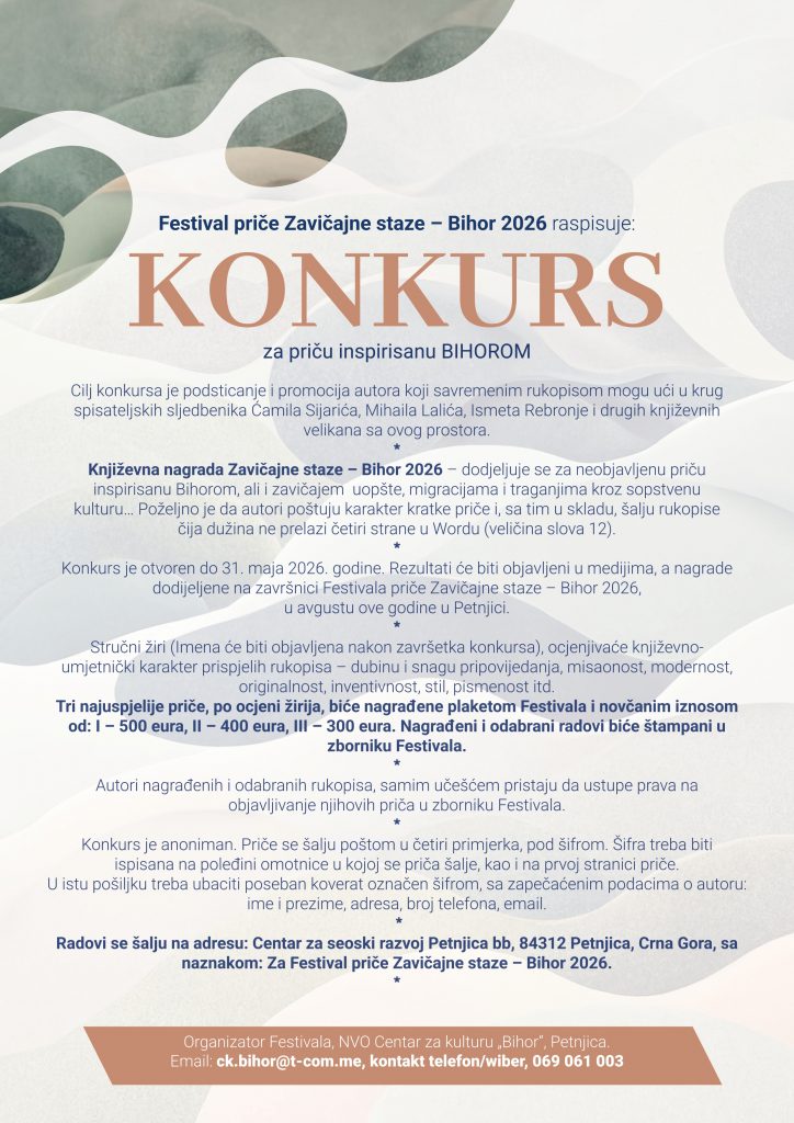 Rezultati će biti objavljeni, a nagrade dodijeljene na završnici Festivala priče Zavičajne staze – Bihor 2026, u avgustu ove godine u Petnjici.