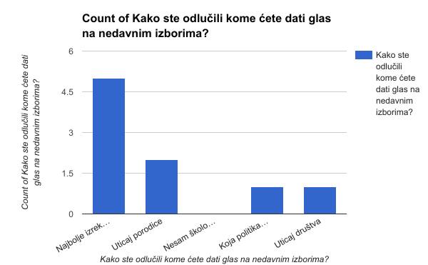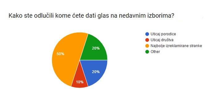 Poslednje pitanje je glasilo kako ste odlučili kome ćete dati svoj glas na izborima, a rezultat je interesantan i donekle kontradiktoran rezultatu iz prethodnog pitanja, a to je: najbolje izreklamirane stranke, sa čak 50 % glasova.