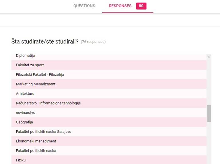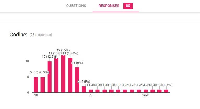 Na osnovu rezultata ove ankete, vidimo da je većina ispitanika starosti od 18 do 24 godine, gdje je prosjek starosti 22.4 godine. Što se tiče obrazovanja, najviše ispitanika pohađa ili je pohađalo fakultete prirodnih nauka, zatim fakultet za strane jezike, pa sve do fakulteta političkih nauka.