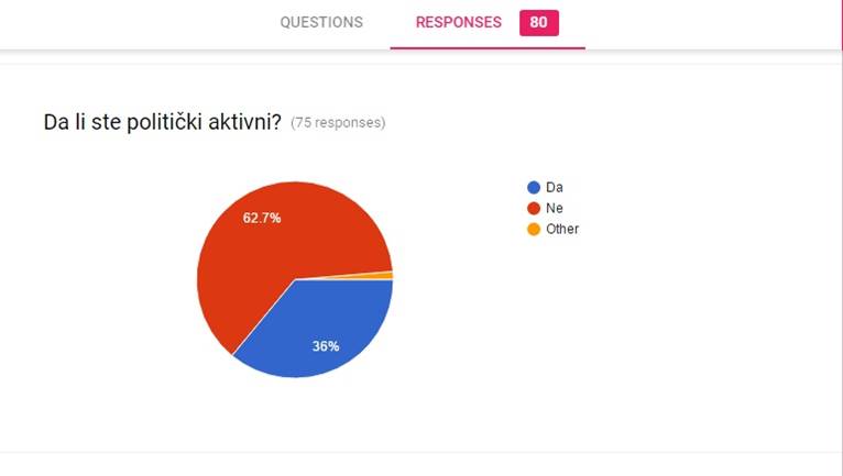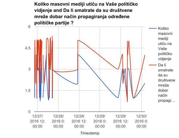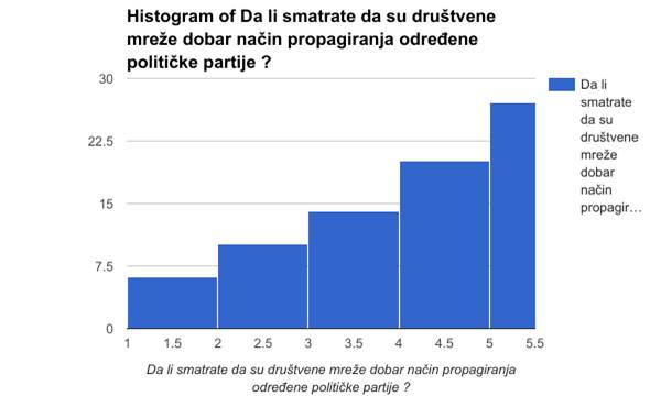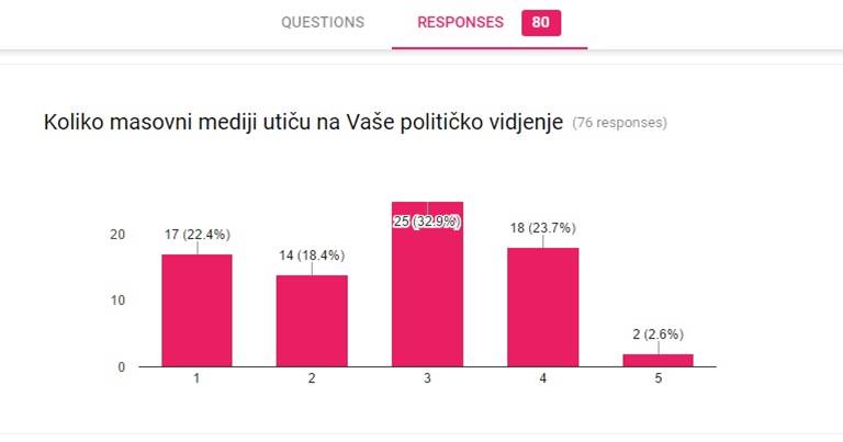 Na pitanje o korišćenju društvenih mreža, čak 84,4 % je odgovorilo pozitivno, za razliku od pitanja da li su korisnici politički aktivni, gdje imamo rezultat sa svega 36% pozitivnih odgovora. Na skali od 1 do 5, koliko masovni mediji utiču na političko viđenje, većina ispitanika se izjasnila za broj 3 (25 glasača) i broj 1 (17 glasača) , što znači da masovni mediji imaju osrednji uticaj na političko viđenje prema većini. Svega 2 glasača su dali negativni odgovor (broj 5). Na skali od 1 do 5, na pitanje” Da li smatrate da su društvene mreže dobar način propagiranja određene političke partije?” imamo većinu ispitanika koji apsolutno smatraju društvene mreže dobrim načinom propagande, tačnije 35,1 %.
