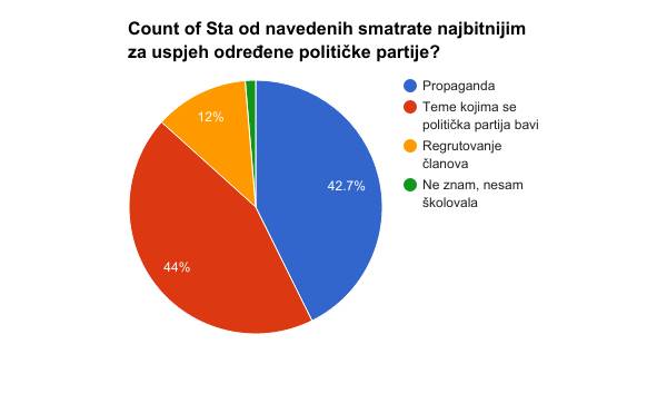Na pitanje, šta od navedenih stavki smatrate najbitnijim za uspjeh određene političke partije (regrutovanje članova, teme kojima se politička partija bavi, propaganda i drugo), većina ispitanika se složila da su to teme kojima se politička partija bavi (44%)i time negirala hipotezu 3, stavljajući propagandu na drugo mjesto.