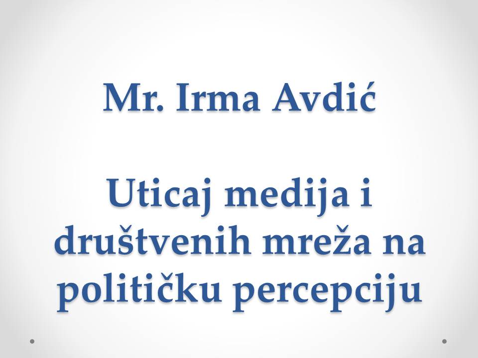 Svrha ovog istraživačkog rada je da ispita vezu između medija, društvenih mreža i političke percepcije, sa focusom na mlade intelektualce, njihovo korišćenje socijalnih mreža i da otkrije u kojoj mjeri utiču na njihovo političko viđenje.U ovom radu korištene su sljedeće metode: Desktiptivna metoda, Metoda rada na tekstu i Servey metoda.