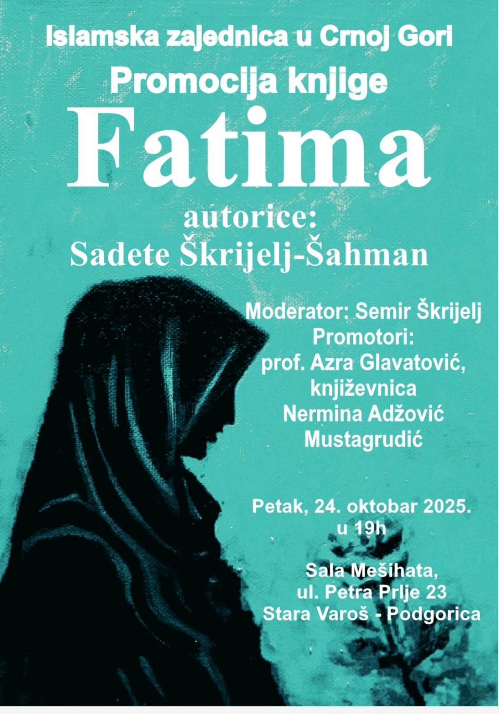 Promocija knjige „Fatima“ autorice Sadete Škrijelj Šahman biće održana u sali Mešihata Islamske zajednice u Crnoj Gori, ul. Petra Prlje 23, Stara Varoš – Podgorica, u petak, 24. oktobra 2025. godine, s početkom u 19 sati.