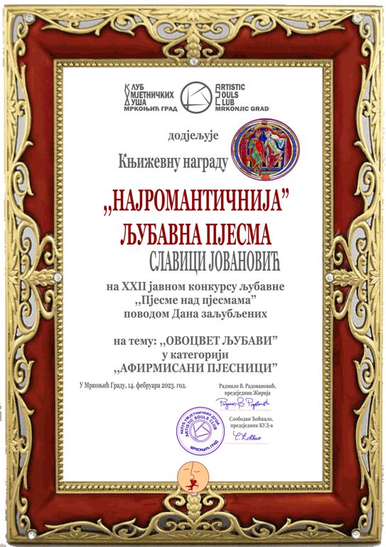 На јавном конкурсу љубавне песме над песма а поводом Дана заљубљених у Мркоњић граду на тему Овоцвет љубави у категорији афирмисаних песника награђена је Славица Јовановић за најромантичнију љубавну песму у организацији КУД Уметничких душа Мркоњић Град