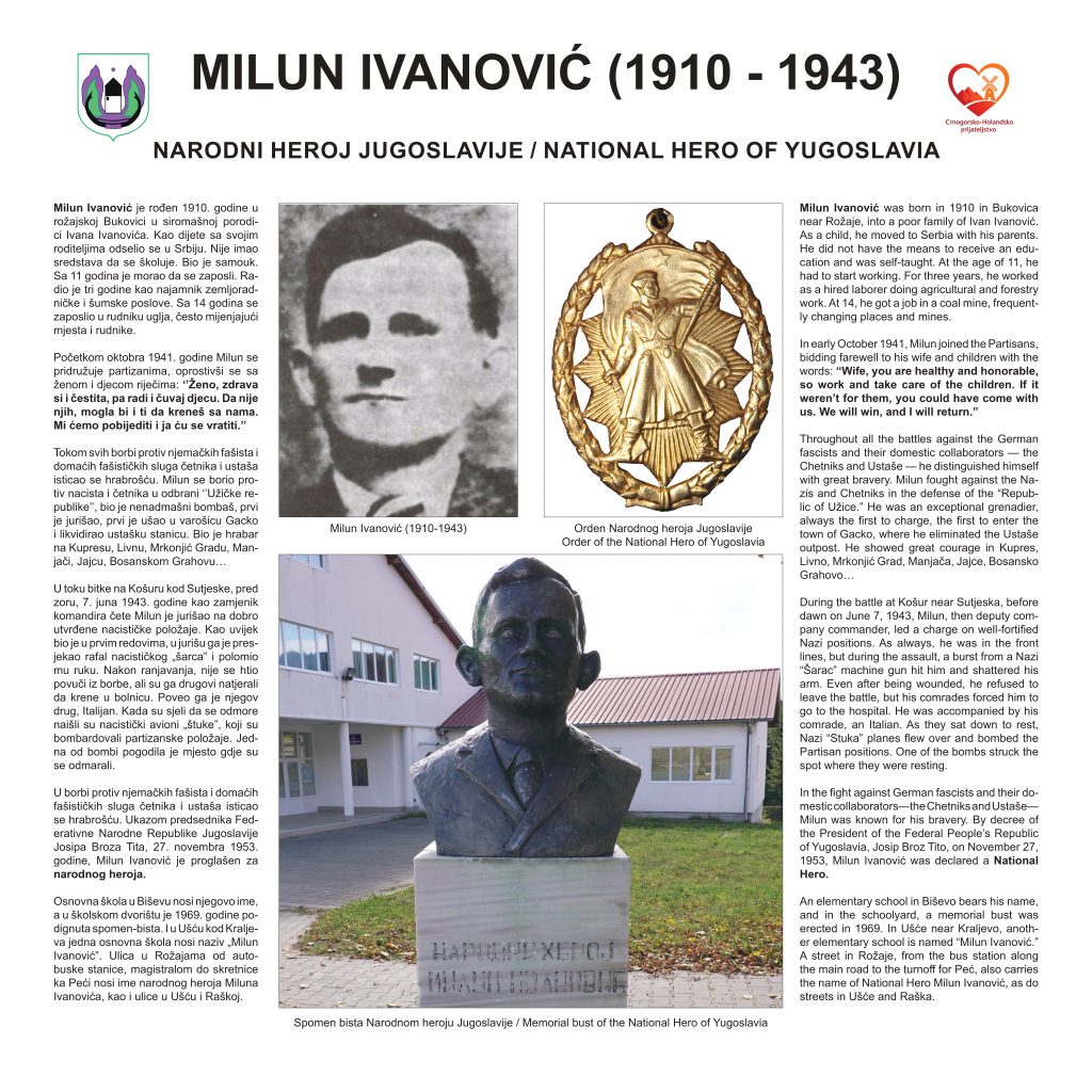 Milun Ivanović je rođen u rožajskoj Bukovici 10. avgusta 1910. godine, a poginuo je na Tjentištu kod Foče 7. juna 1943. godine kao učesnik Narodnooslobodilačke borbe. Ukazom predsjednika Federativne Narodne Republike Jugoslavije Josipa Broza Tita, 27. novembra 1953. godine, proglašen je za narodnog heroja. Bista Miluna Ivanovića iz 1969. godine je djelo vajara Milomira Bulatovića kojom je ovaj narodni heroj iz Rožaja prikazan kao odlučan i snažan revolucionar. Osnovne škole u Biševu kod Rožaja i Ušću kod Kraljeva nose njegovo ime, kao i ulice u Rožajama, Ušću i Raški.